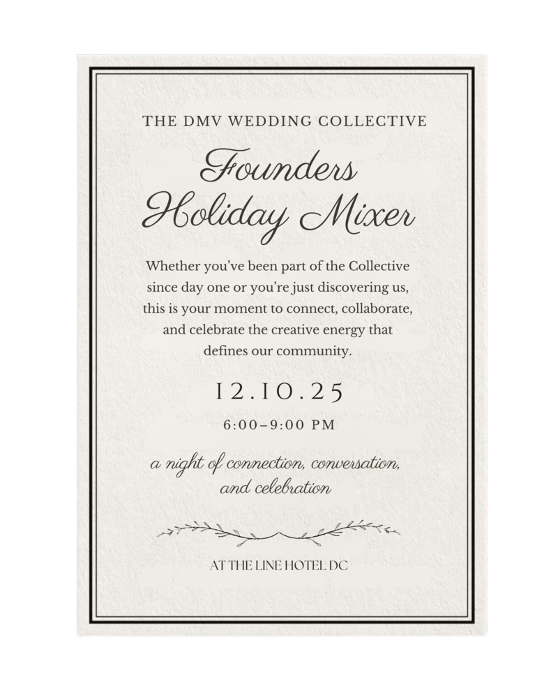 The DMV Wedding Collective Founder’s Holiday mixer is a night to celebrate our launch, mingle with fellow industry leaders, and toast to the year ahead.